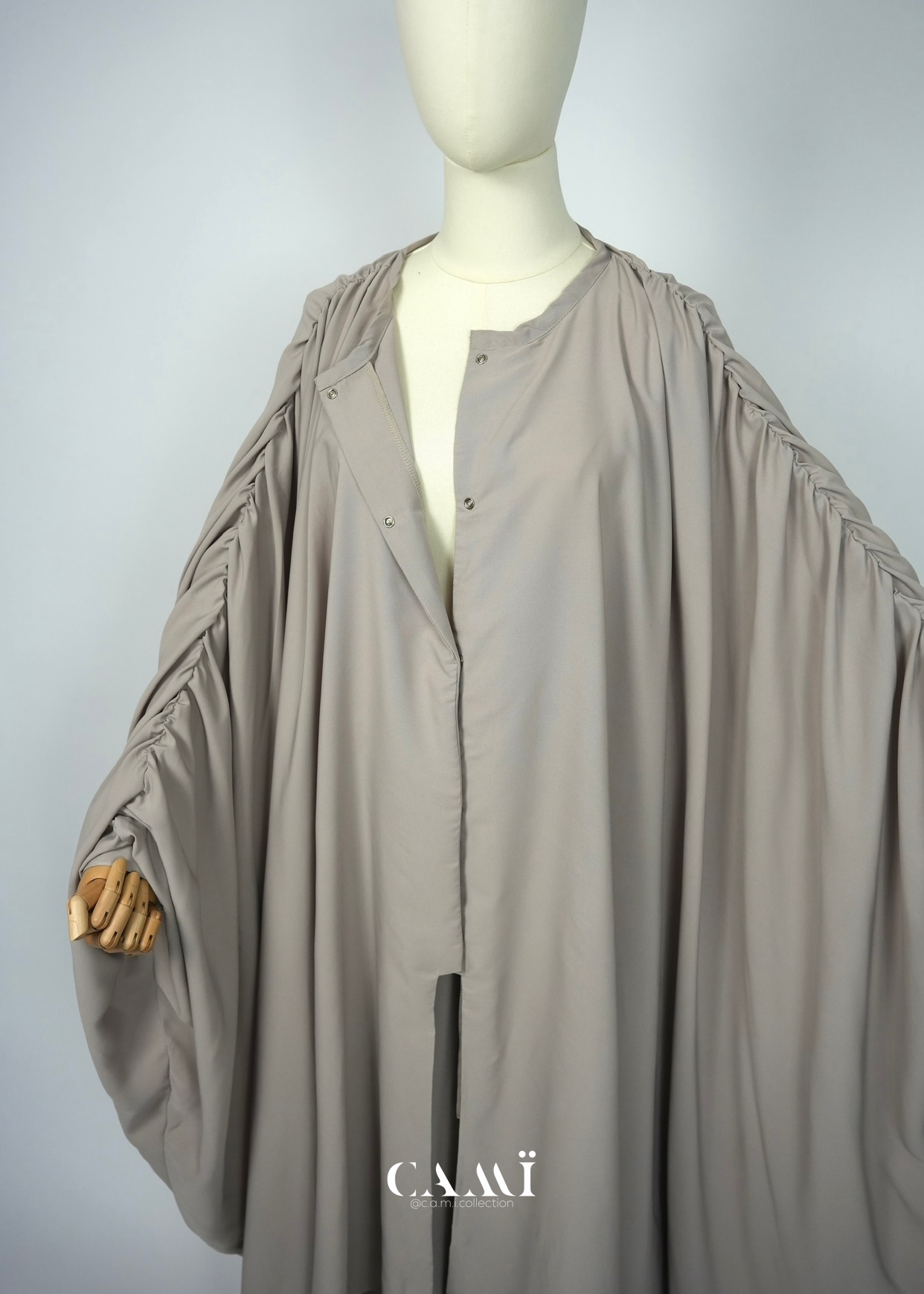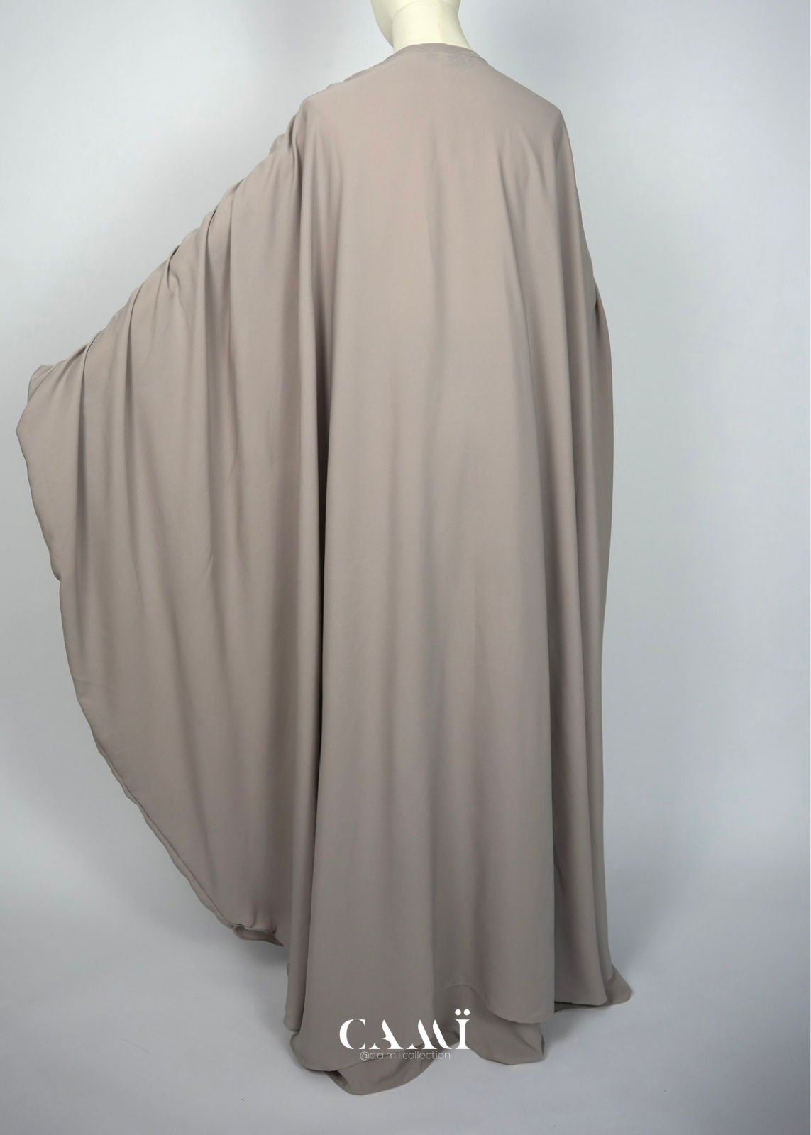 The Abaya Set consists of an Abaya Cape with beautifully detailed sleeves and a skirt. With the skirt, which has integrated straps on the elastic waistband, the abaya set can be individually adjusted to your size.