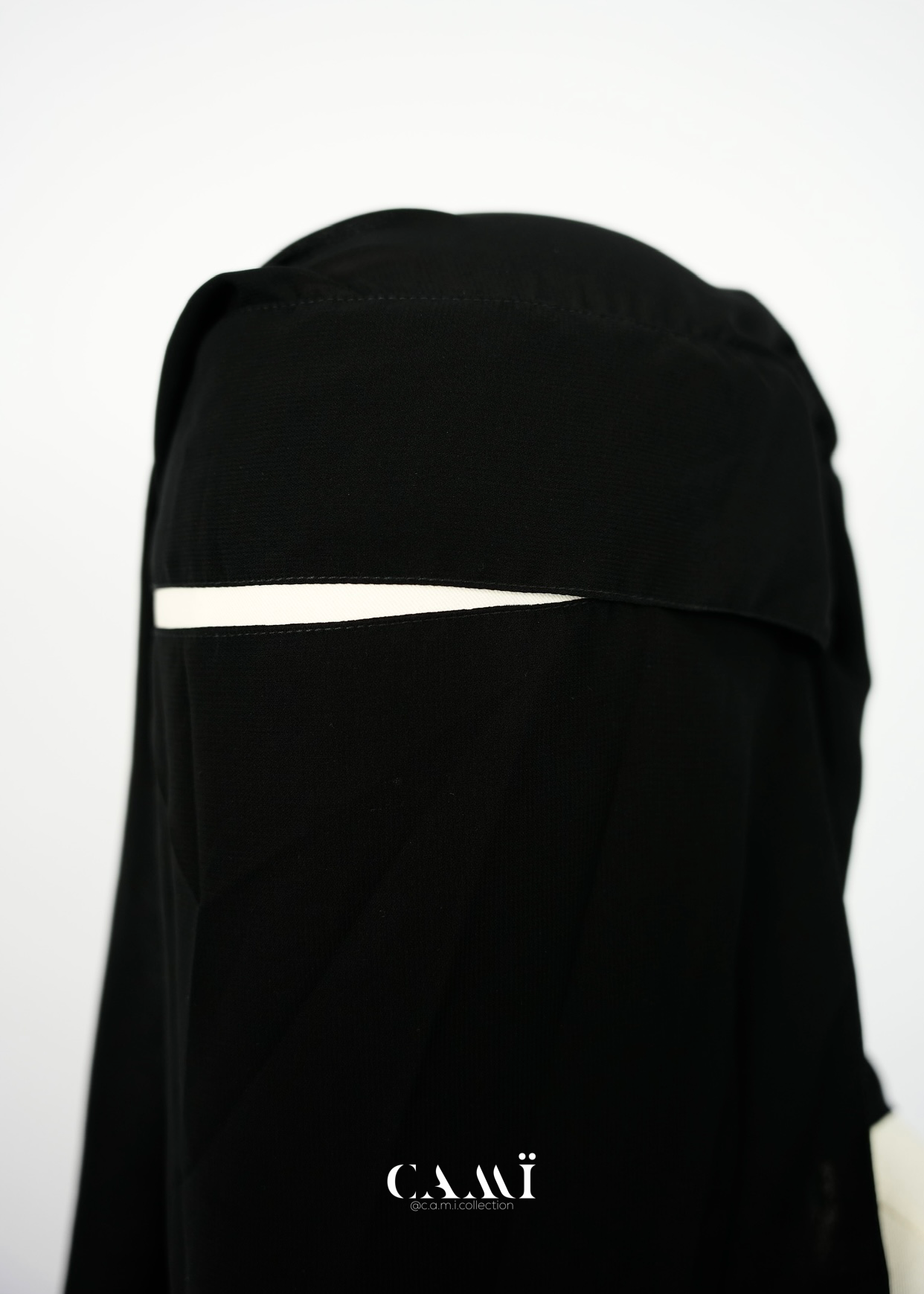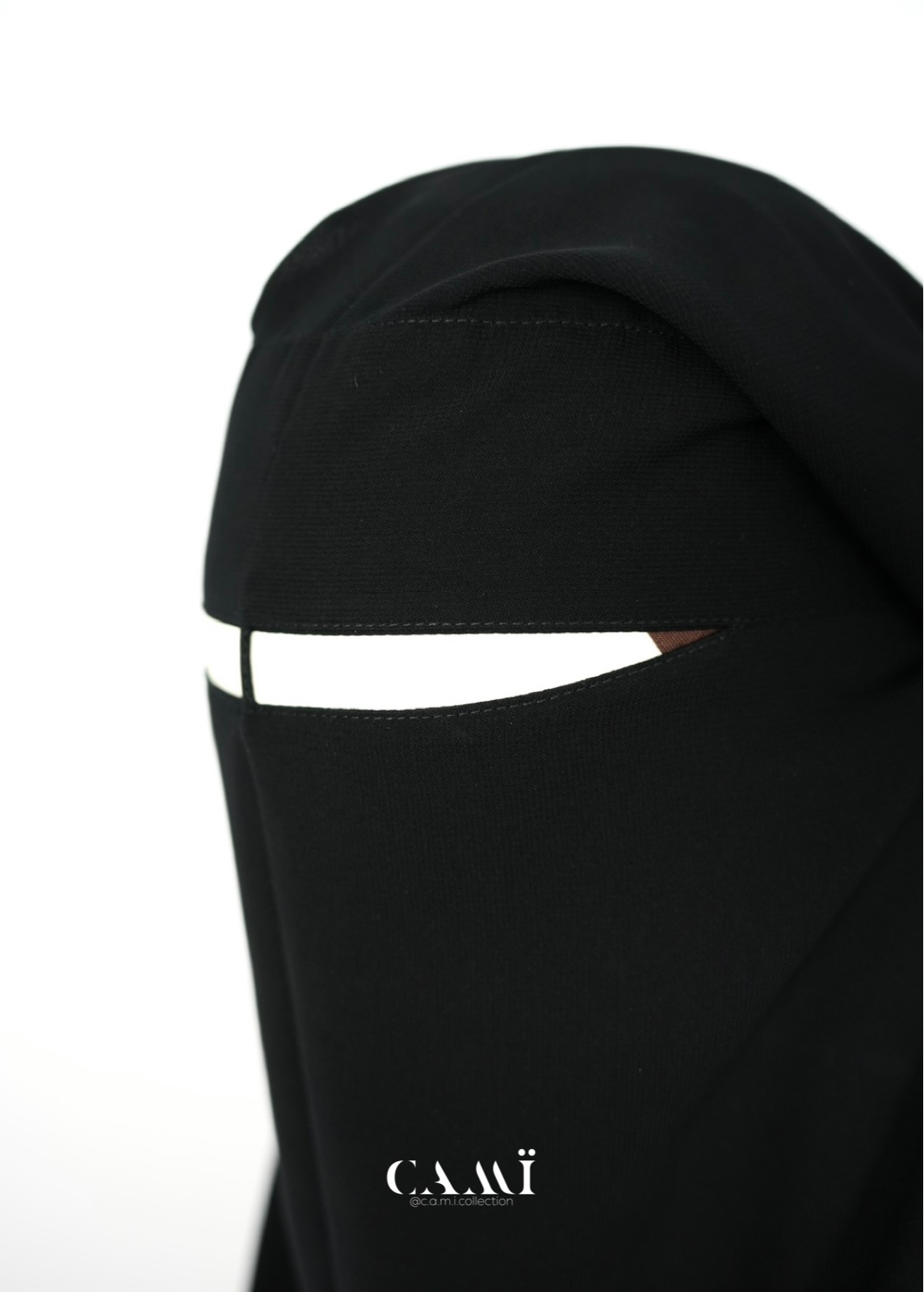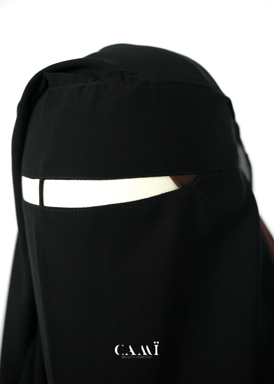 This beautiful two-layered, extra-long niqab with flap looks particularly elegant thanks to its long, rounded-cut fabric layer, which can be worn at the back or draped beautifully over the side, over one shoulder.
